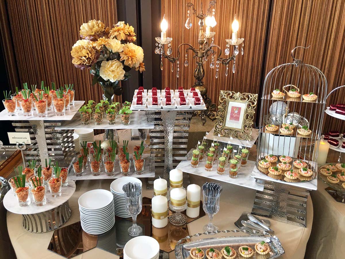 ** โต๊ะจัดวางไลน์อาหารคอกเทล  และ อุปกรณ์จัดเลี้ยงทุกชนิดทางร้านจัดเตรียมไปเอง